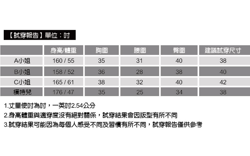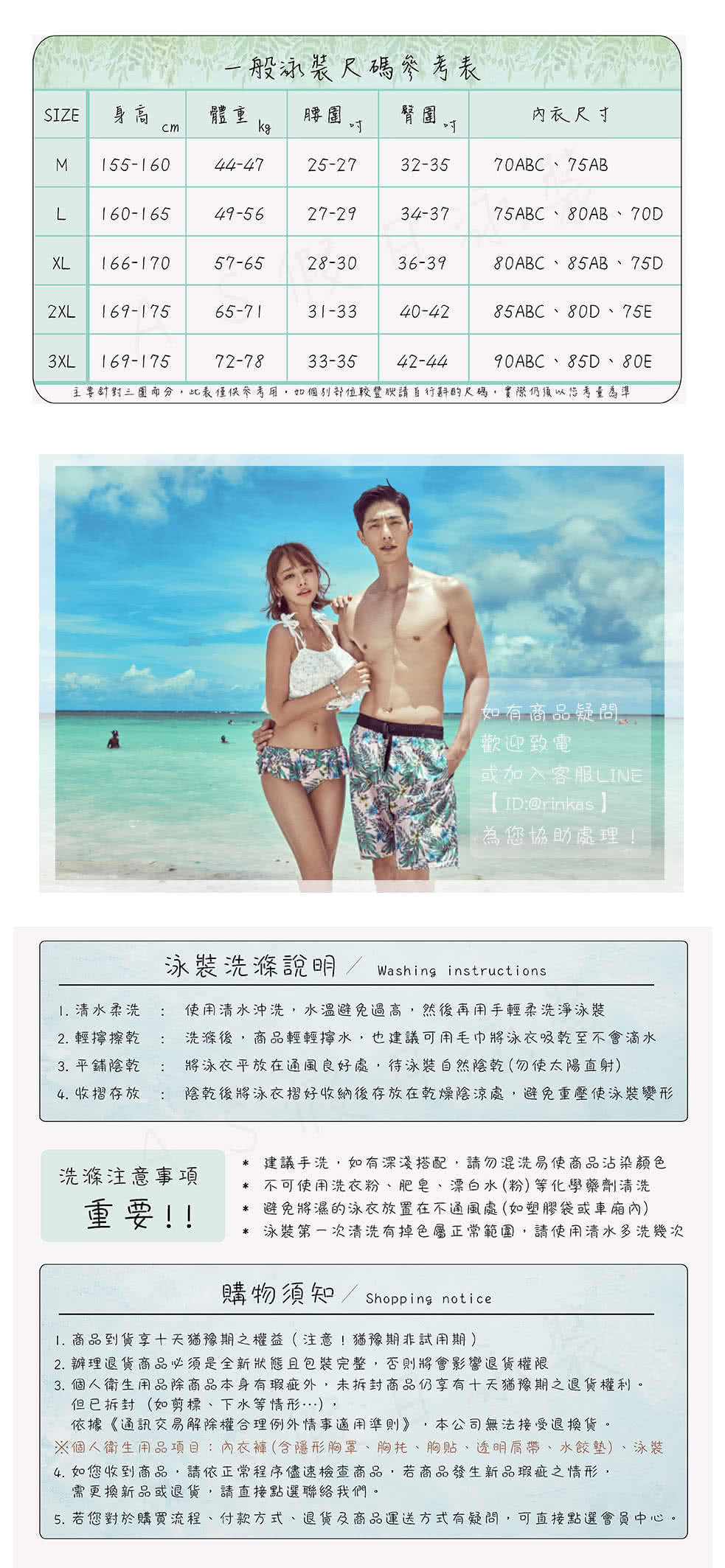ㄧ般泳裝尺寸參考表: 尺碼 身高 體重 臀圍 腰圍 內衣 M--155-160cm 43-48KG 32~35吋 25~27吋 70ABC、75A L--160-165cm 49-57KG 34~37吋 27~29吋 75ABC、80A XL-166-170cm 58-65KG 36~39吋 28~30吋 80ABC、85A