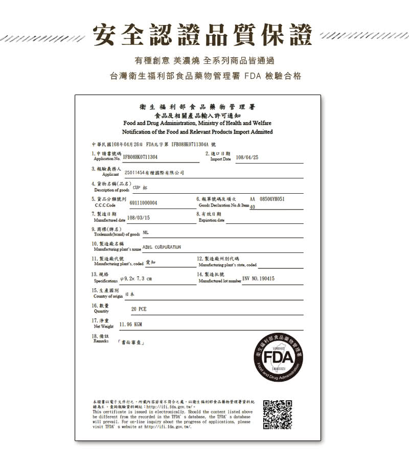 ■ 材質:陶 ■ 配件:包裝紙盒 ■ 尺寸:直徑 9.2 × 7.3 cm(單個) ■ 容量:250 ml ■ 產地:日本製造.原裝進口 ■ FDA檢驗合格證號:北字第 IFB08HK0711202A 號 注意事項: ■ 陶瓷器手繪或手工製品出現輕微的上色不勻,為手工製作特點難以避免, 非品質瑕疵問題,且不影響正常使用。 ■ 商品皆為日本製造,原裝進口,並經台灣海關食品容器安全檢驗合格。 食品業登錄字號為:F-125011454-00000-5 ■ 日本原廠指定授權經銷,合乎日本當地檢測標準,品質有保證。 ■ 商品顏色會因電腦螢幕設定、室內/戶外光線不同而略有差異,請以實際 收到商品為準。 ■ 商品如需退換貨請保持商品完整、無刮傷,且商品必須為『全新未經使用』 狀態,且完整包裝(包含購買商品、附件、內外包裝、說明書、贈品等)。